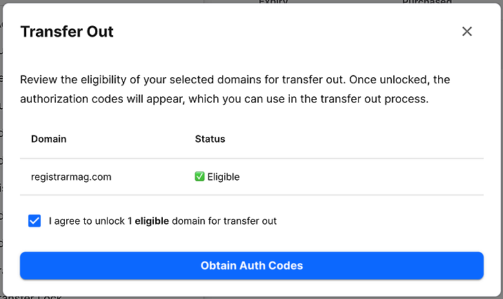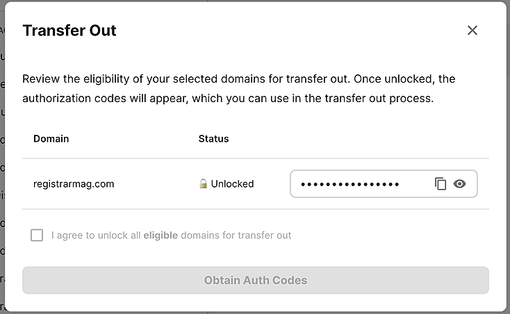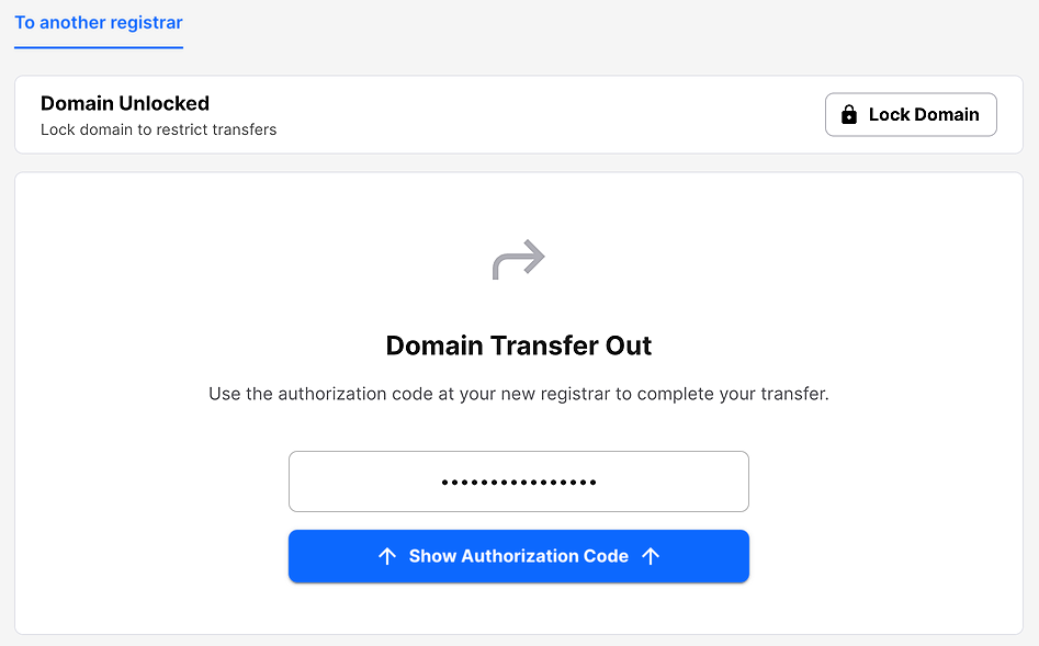 When the domain is fully unlocked, click the Show Authorization Code to get the code.